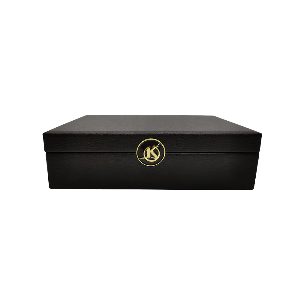 Kit sceau et cire dans un coffret avec un sceau en alliage de métaux logo K gravé, de la cire orange et 3 enveloppes