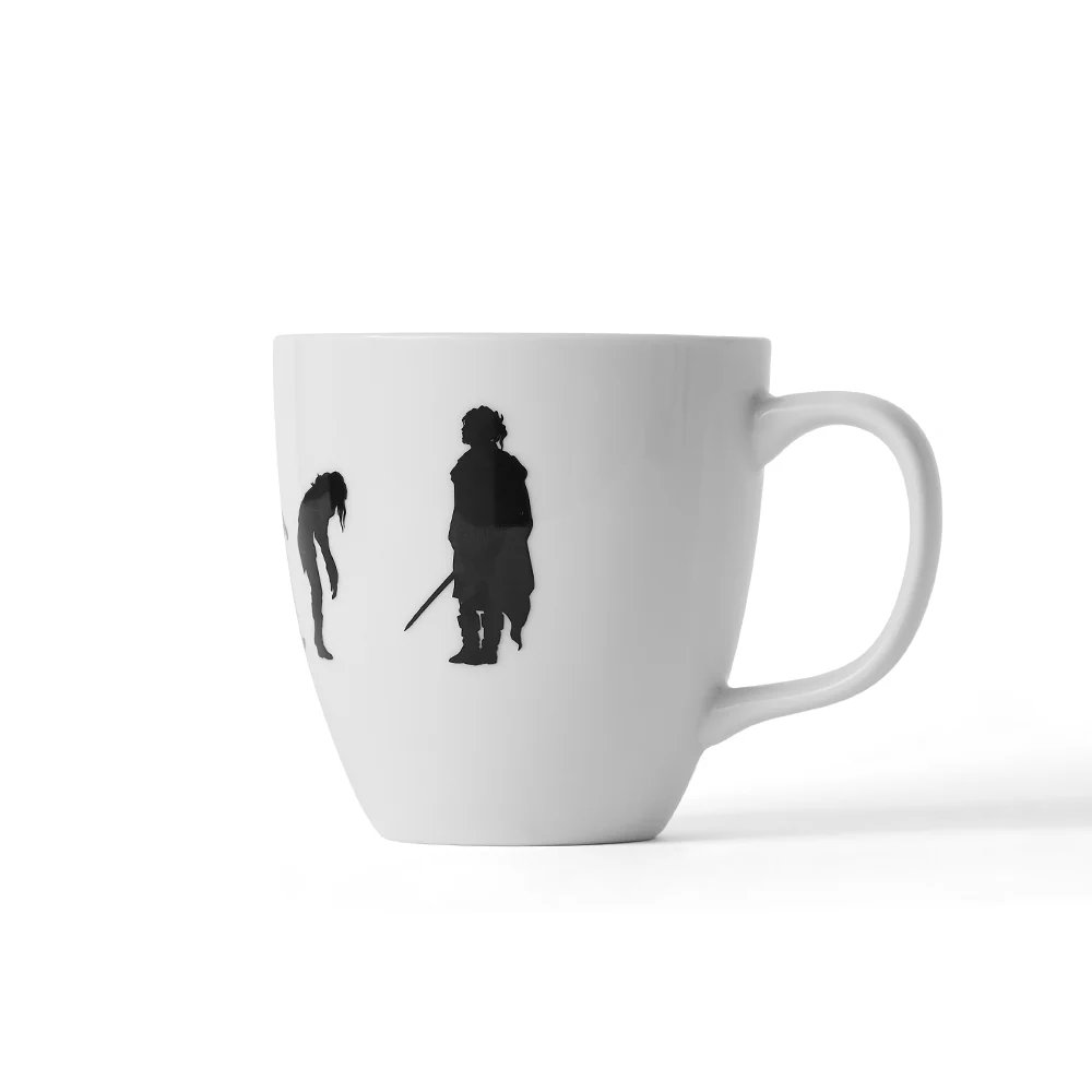 Mug blanc avec impression frise Kaamelott et logo « K » en dessous.